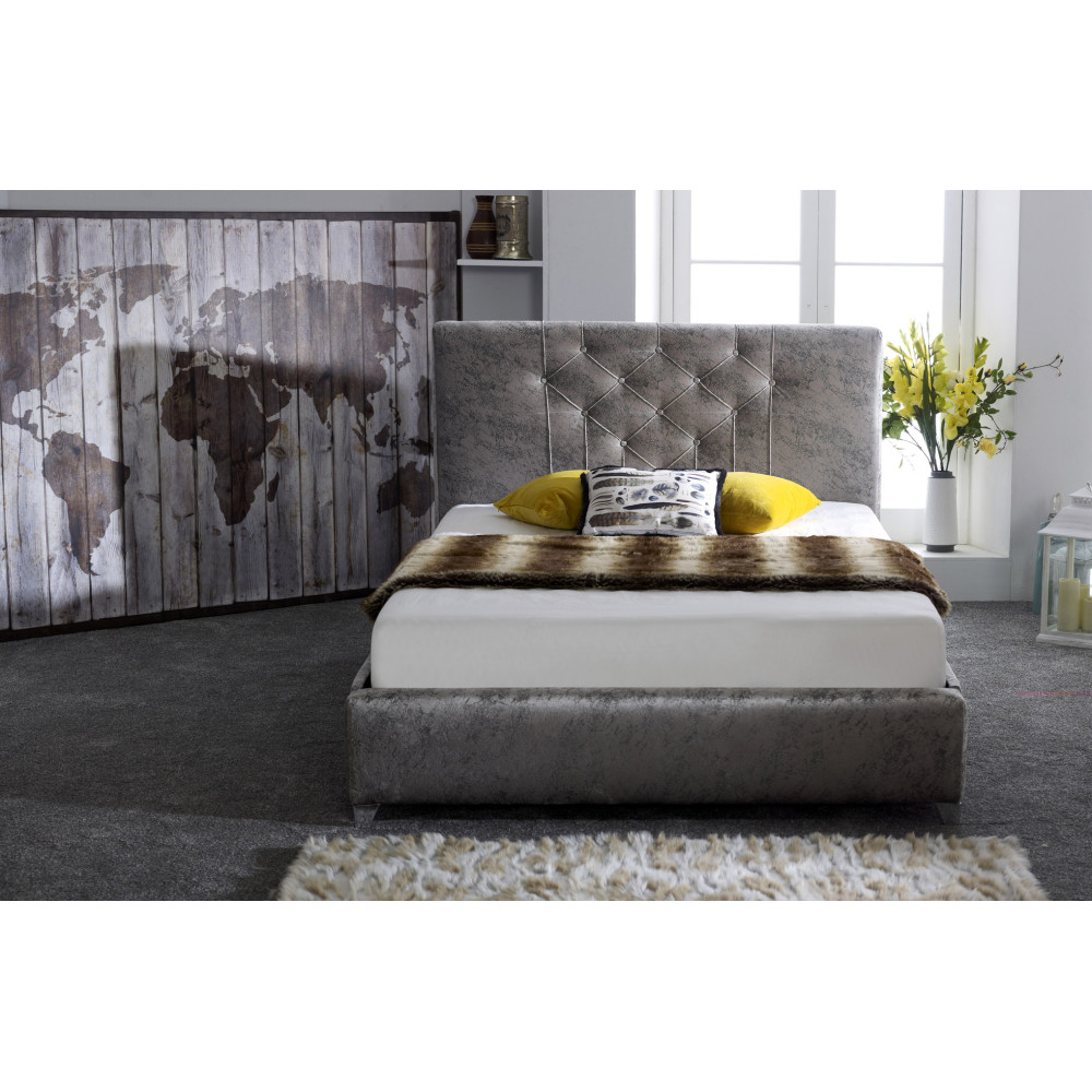 Trento bed frame is inspired by classic sleigh-style with a luxurious deep-buttoned winged headboard which will be highlight of your bedroom. This product is upholstered in quality hardwearing Pearl finished Chenille fabric complemented by Chrome feet for good support. This bed is designed for a place for true relaxation and comfort