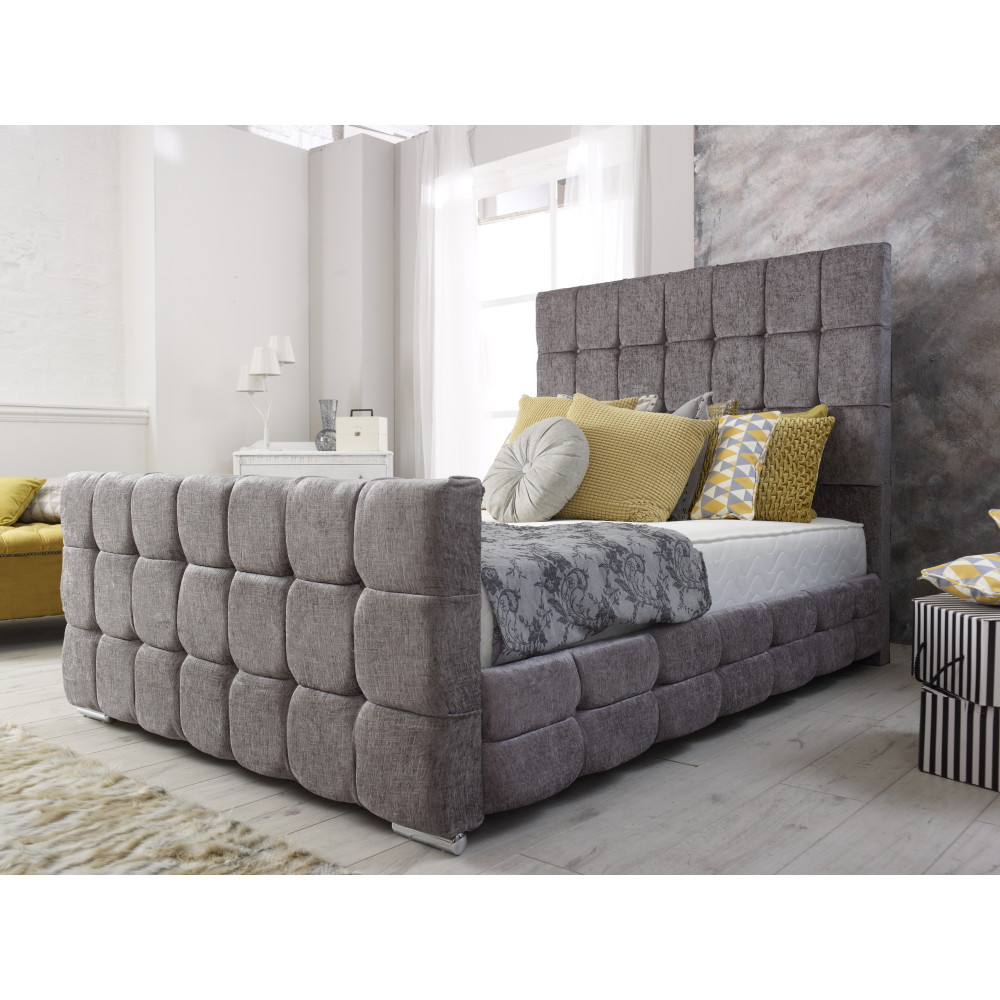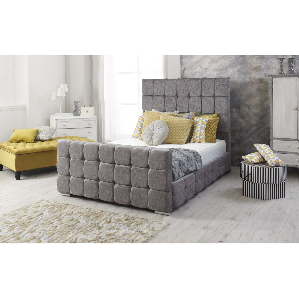 A great addition to the Woodlands Furniture Range. The Chesterfield Royale Bed frame available in Crushed Velvet, Soft Velvet, Chenille and Naples will bring luxury to your bedroom with our carefully selected soft to the touch fabrics. The cubed headboard and footboard comes with stylish chrome feet. The base has slatted finish for added comfort and mattress support.